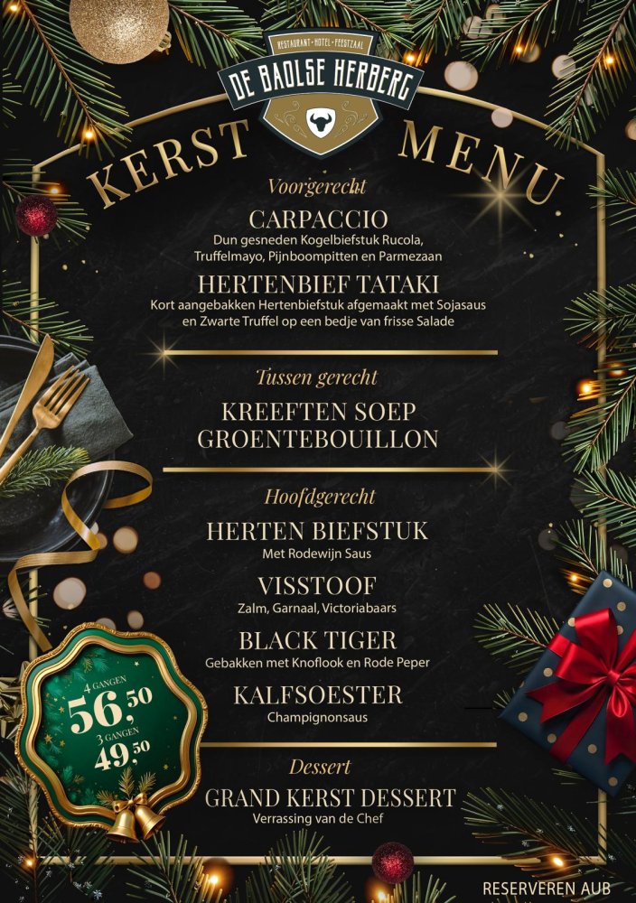 KERSTMENU 2025 24 december - 25 december de Baolse Herberg kerstavond en 1e kerstdag 2025 Lees verder Een overheerlijk kerstmenu van 3 of 4 gangen op kerstavond 1e kerstdag. Reserveren gewenst Pastoor de Katerstraat 23, Baarle-Hertog