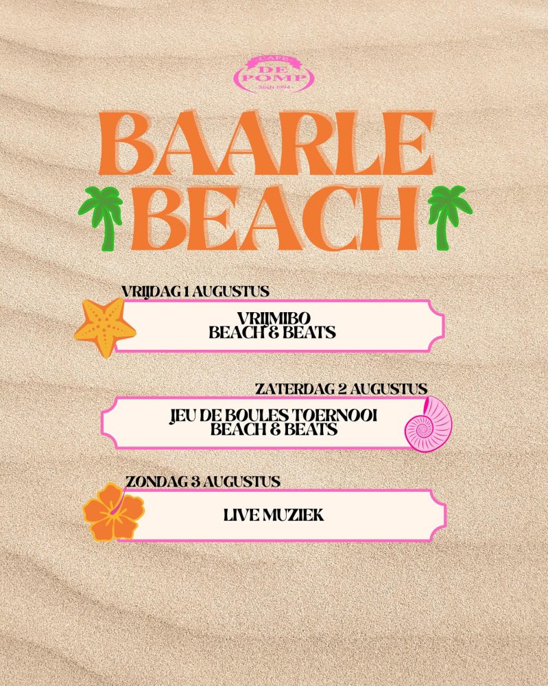 Baarle Beach 1 augustus - 3 augustus Café de Pomp Café de Pomp tovert het plein tegenover de Pomp om tot een tropisch paradijs van vrijdag 1 augustus t/m zondag 3 augustus. Lees verder Met trots presenteren wij: de allereerste editie van BAARLE BEACH! Café de Pomp tovert het plein tegenover de Pomp om tot een tropisch paradijs van vrijdag 1 augustus t/m zondag 3 augustus.Zand tussen je tenen, zomerse drankjes & zonnige deuntjes! Slippers aan, zonnebril op en beleef het ultieme zomerweekend in Baarle! Singel 12, 5111 CD Baarle-Nassau