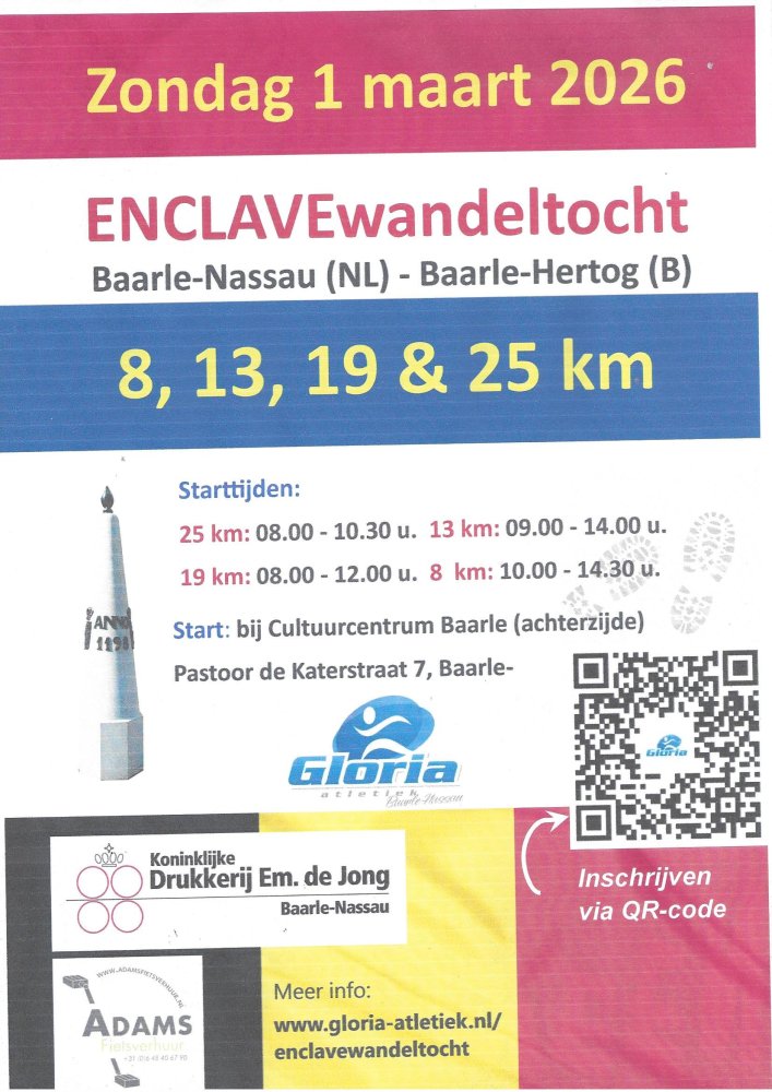 Enclave wandeltocht zondag, 1 maart 08:00 Cultuurcentrum Baarle Enclavewandeltocht, diverse afstanden. Lees verder Enclavewandeltocht: 6,5 13, 19 & 25 kmStarttijden:25 km: 08.00 - 10.30 u. 13 km: 09.00 - 14.00 u. 19 km: 08.00 - 12.00 u. 6,5 km: 10.00 - 14.30 u.Start bij Cultureelcentrum Baarle (achterzijde)Pastoor de Katerstraat 7, Baarle-NassauMeer info: https://www.gloria-atletiek.nl/enclavewandeltocht Pastoor de Katerstraat 5-7, 5111 CM Baarle-Hertog-Nassau