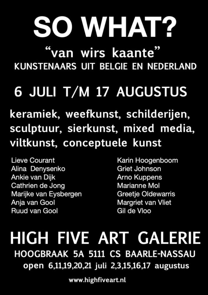 Openingsuren: zaterdag en zondag van 13-17 uur 14, 27 en 28 september 11, 12, 25 en 26 oktober 8,9, 22 en 23 november verder op afspraak: www.highfiveart.nl