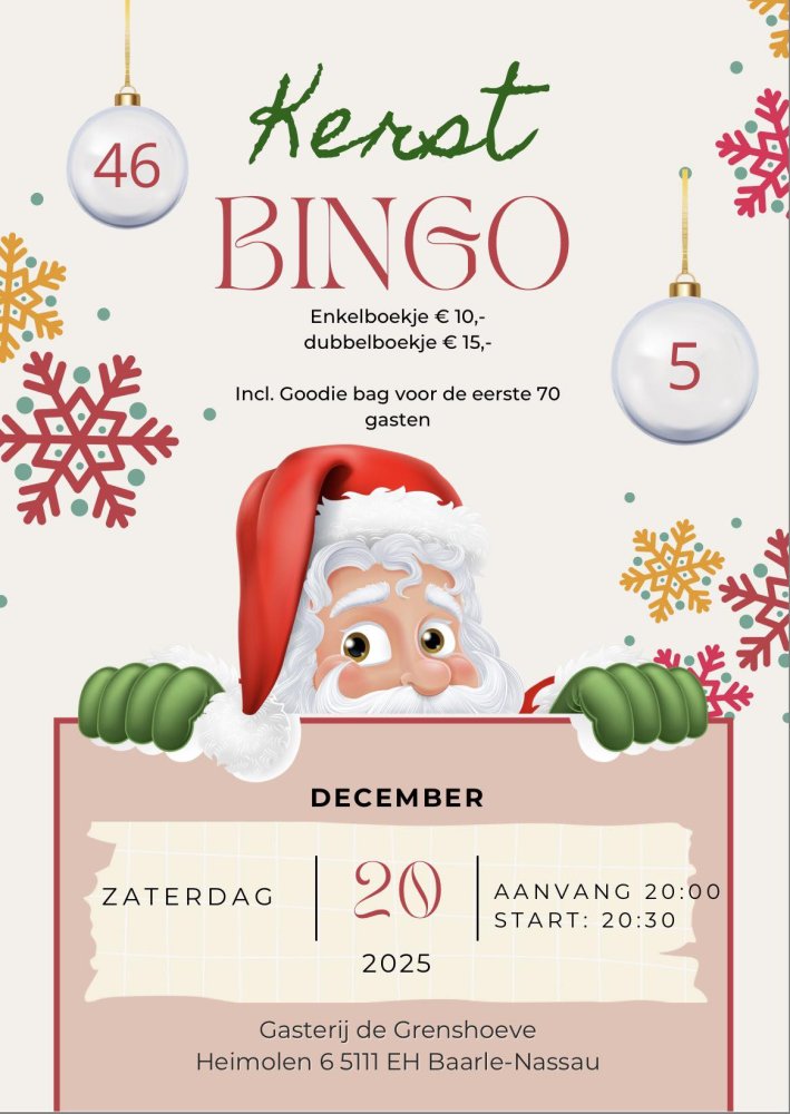 Kerstbingo Gasterij de Grenshoeve zaterdag, 20 december 20:30 Gasterij / speeltuin de Grenshoeve Kom gezellig naar onze kerstbingo. Lees verder Kom gezellig naar onze kerstbingo op zaterdag 20 december. Aanvang 20.00 uur. Start 20.30 uur. Heimolen 6, Baarle-Nassau