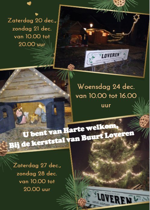 De kerststal op Loveren is geopend op onderstaande tijden. Op deze momenten is er iemand van de buurtvereniging aanwezig, zodat je een drankje kunt nuttigen. Er ligt een wandelroute klaar, ook is er een toilet aanwezig en je kunt jezelf opwarmen bij het vuur van de houtkachel.