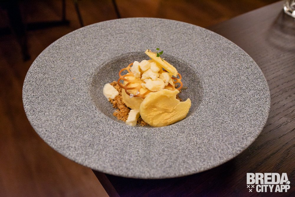 Na de voorgerechten volgen de hoofdgerechten. We beginnen met de Buffalo wings, met malse kip in een krokant jasje, geserveerd met Gochujang-mayonaise, coleslaw en frites. De Orzo, met tomatenpesto, gegrilde groenten en gefrituurde knolselderij, vormt een mooie combinatie. De kalfssukade is heerlijk zacht, geserveerd met mousseline, spruitjes en stoofpeer.